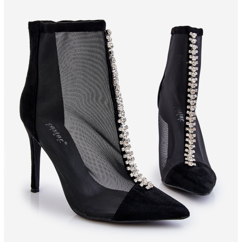 Fashionabla kvinnors stövlar på Rummi High Heels - Svart, sensuellt och elegant. Kombinationen av mjuk ekosmocka med ett öppet nätet ger dem lätthet och modern karaktär, och glänsande strass som imiterar strass betonar subtilt framsidan av den övre. En smal näsa i en spitz och en hög häl av stiftet smalar optiskt benen, vilket skapar en effektiv, kvällsutseende.