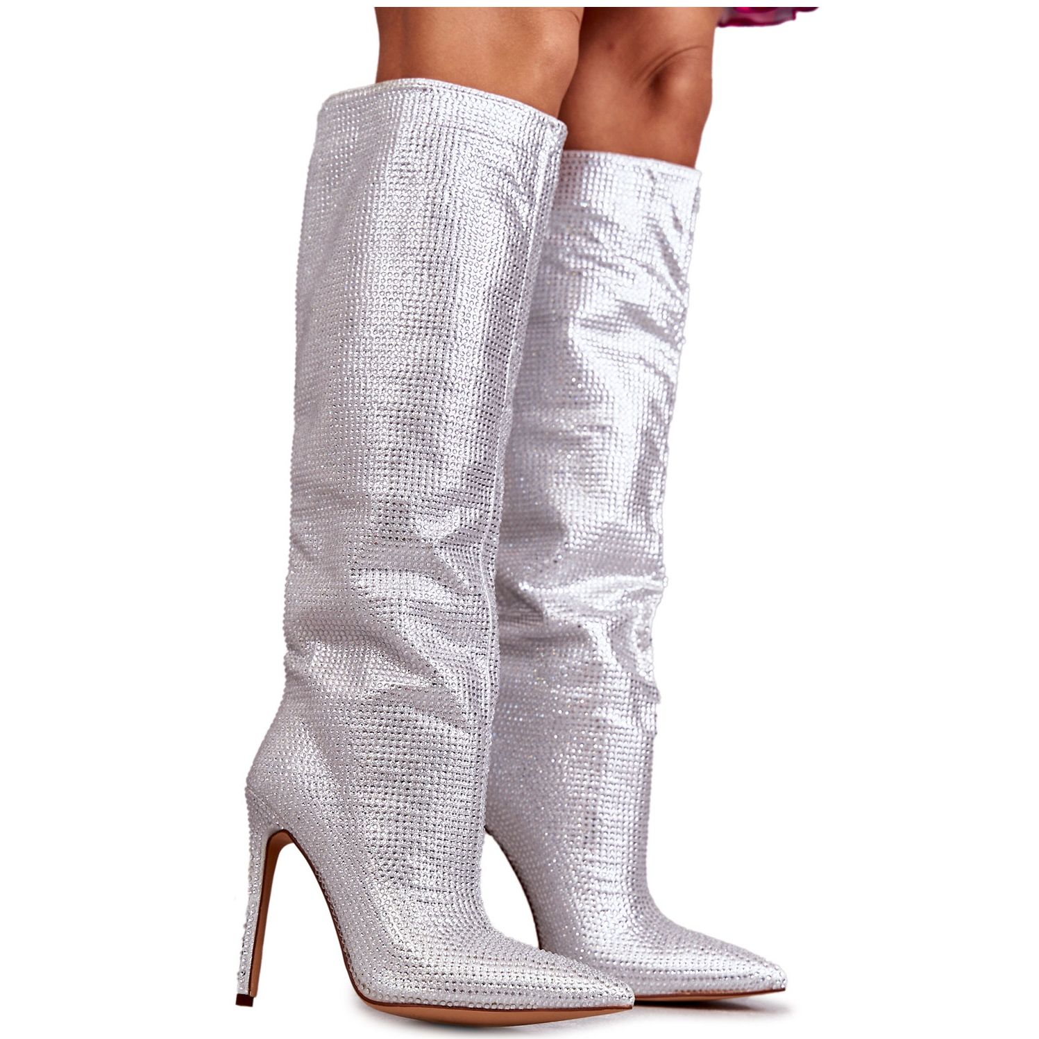 Fashionabla högklackade silverstövlar med cubic zirkoner
