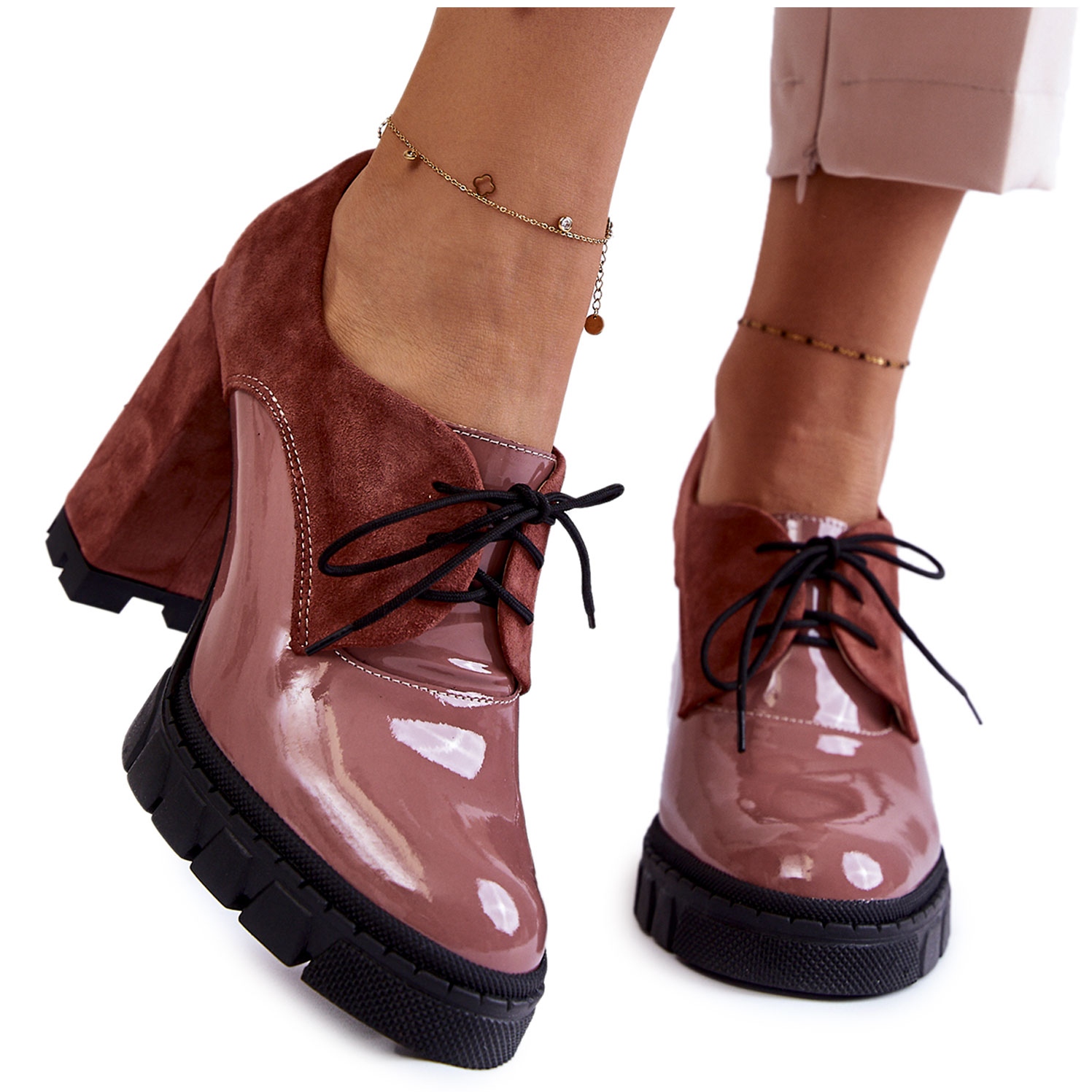 Detaljer: PA2 Fashionabla mocka och lackade stövlar på den rosa carisa-plattformen