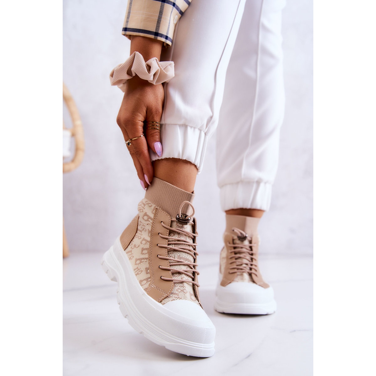 Upptäck den senaste modetrenden med beige FW1 sneakers Fashionabla sneakers Wysoka Skarpeta. Dessa snygga damskor kännetecknas av en övre räckvidd ovanför ankeln, gjorda av högkvalitativt textilmaterial med ett intressant mönster. Deras elastiska elastiska band anpassar sig perfekt till benets bredd, vilket säkerställer bärkomfort hela dagen.