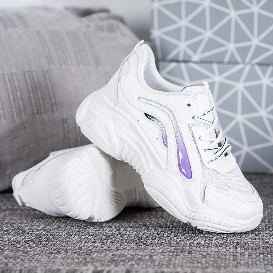 Estetiskt kännetecknas denna modell av en vit nyans av den övre, dekorerad med en lila accent, vilket ger en unik karaktär. Den universella vita färgen gör dem till ett mångsidigt tillskott till många set - från vanliga jeans och sweatshirts till mer eleganta kjolar och klänningar.