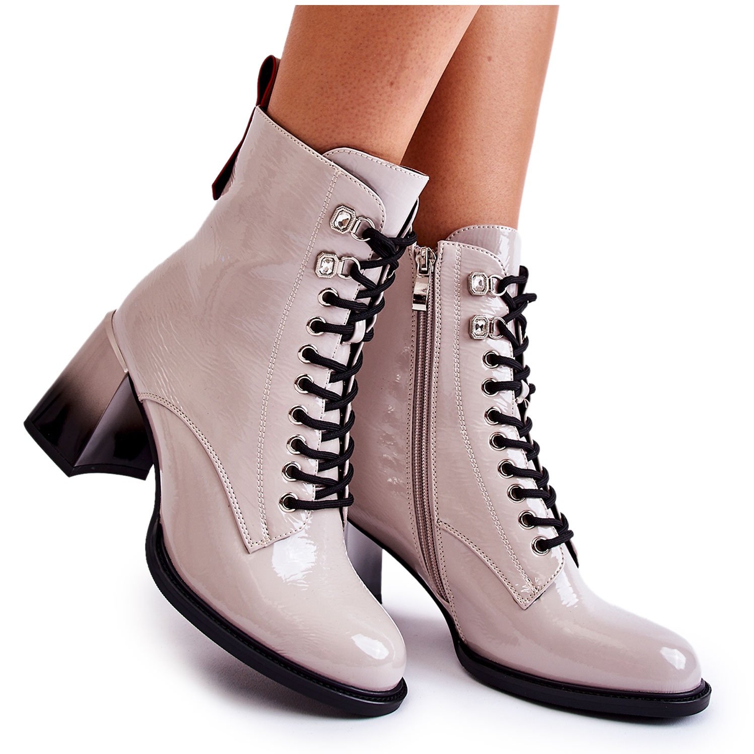 Knäppt med dragkedja på sidan och snörning säkerställer de en perfekt passform till benets bredd, vilket gör att de är bekväma att bära hela dagen. Tillverkade av högkvalitativt ekologiskt läder, de kännetecknas av en styvad häl och en rundad tå, vilket ger feminin charm.