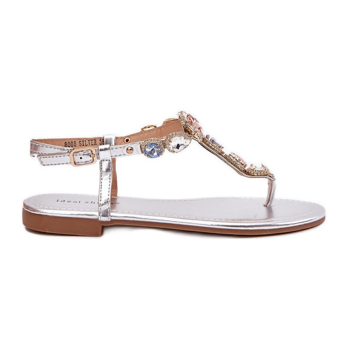 Upptäck unika platthelade kvinnorsandaler med kristaller i en elegant silverfärg. Dessa snygga sandaler tillverkade av högkvalitativa ekoläder kombinerar komfort med fashionabla design, vilket gör dem till det perfekta valet för sommardagar.