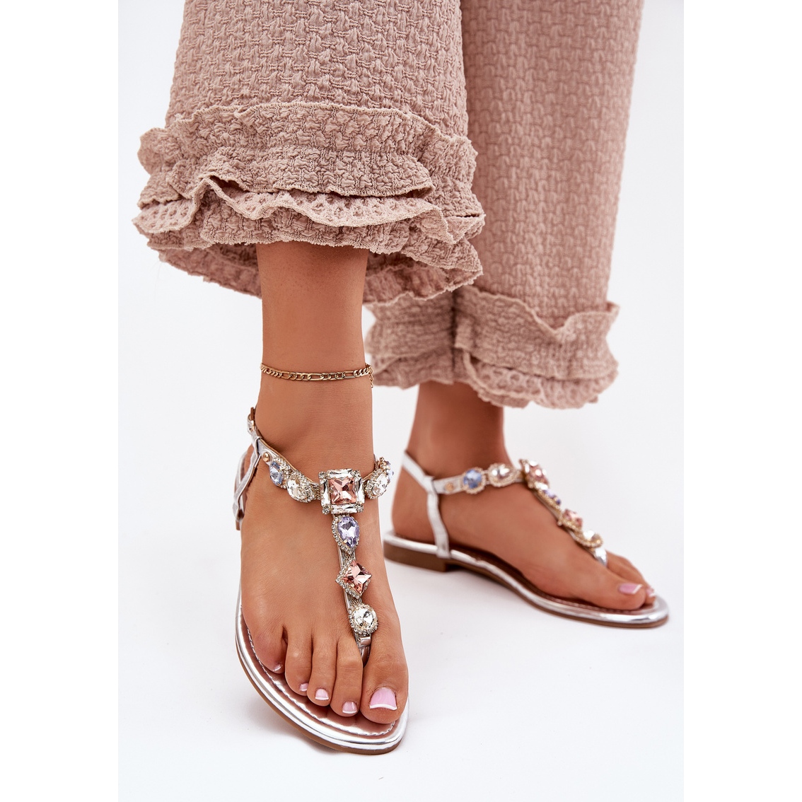 Denna modell kännetecknas av en platt häl med en höjd av 1,5 cm, vilket säkerställer komforten att bära hela dagen, oavsett tillfälle. Tack vare spännet kan sandaler enkelt matcha din fot, vilket ökar komforten och stabiliteten när du går. Dekorativa kristaller ger dem glans och lite elegans, effektivt fångar ögat.