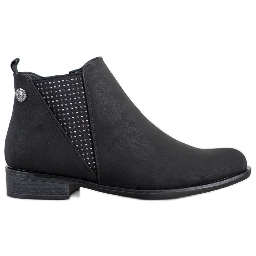 Det finns en praktisk dragkedja på sidan som gör det lättare att ta på dem, och en gummikil dekorerad med silver strass, vilket ger skorna en subtil men effektiv accent. Sulan i syntetiskt material är slät vilket säkerställer grepp och komfort vid varje steg, och den platta 3 cm höga hälen gör stövlarna extremt bekväma.