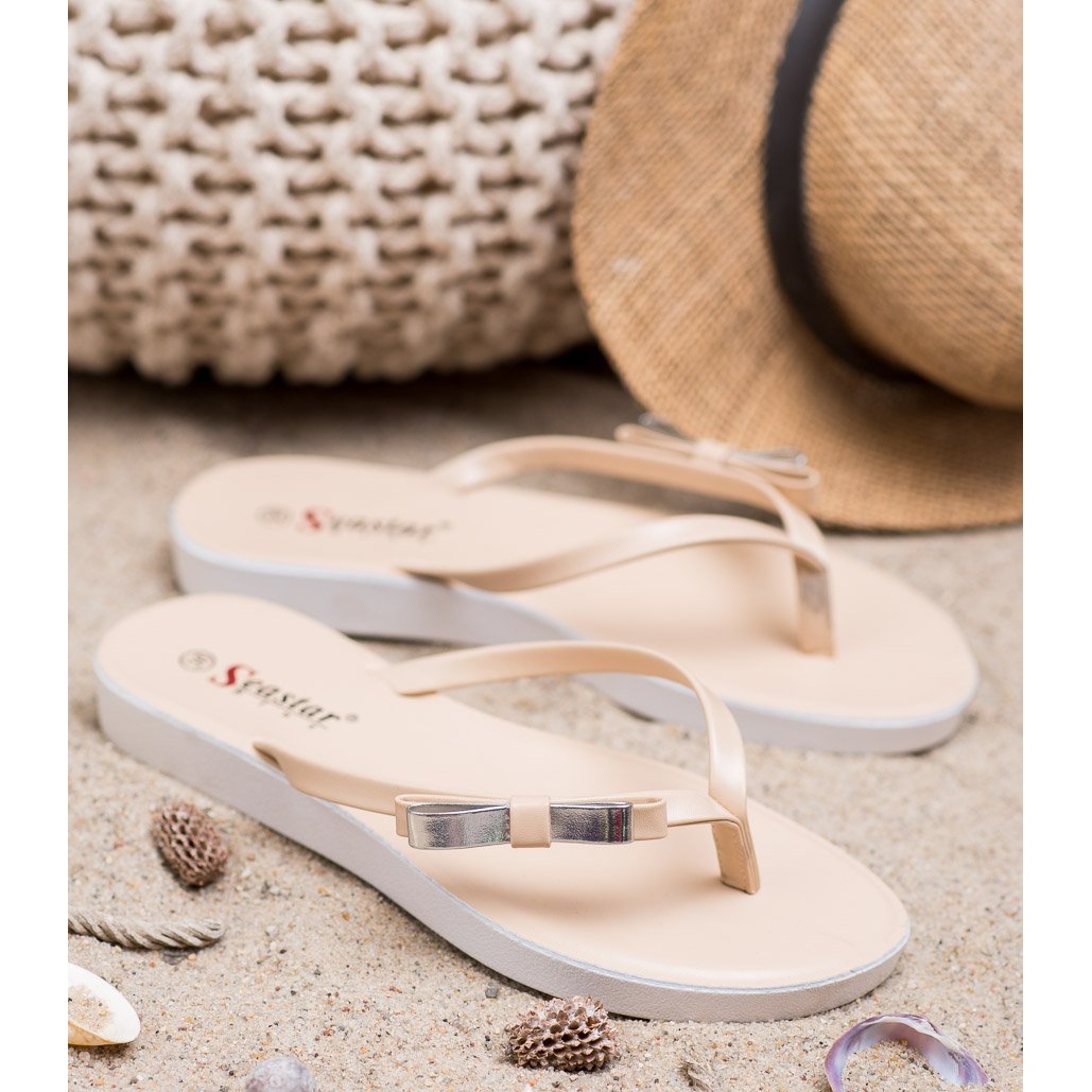 Tillverkade av högkvalitativa material, Seastar flipflops är utrustade med en platt gummisula som säkerställer utmärkt stabilitet och bärkomfort. Tack vare sulans egenskaper glider flip-flopsna inte när de går, vilket är särskilt viktigt under varma sommardagar. Deras universella beige färg och höga, 2 cm tjocka plattform gör att de matchar perfekt med jeans, korta kjolar och luftiga klänningar.