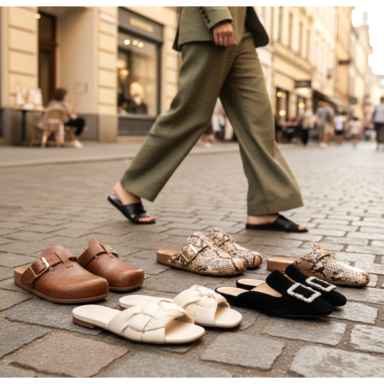 Mulor säsongen 2026 är framför allt förfinade. Modeller gjorda av naturligt läder eller mocka, i beige, konjak, svarta eller flaskgröna färger - det här är skor som ser bra ut både på kontoret och på semester i staden.