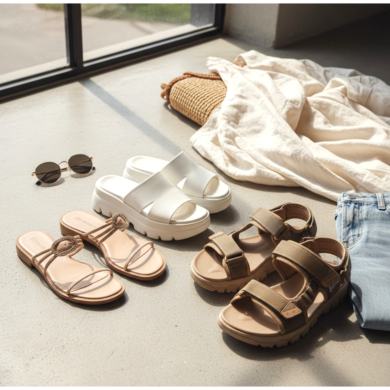 Den tredje riktningen är sportflipflops – inspirerade av Birkenstock, Teva sandaler eller liknande utomhusmodeller. Numera bärs de med bomullsklänningar, baggy jeans och linnekläder. Deras charm ligger i deras avsiktligt avslappnade estetik, som kan beskrivas som cool-ansträngningslös.