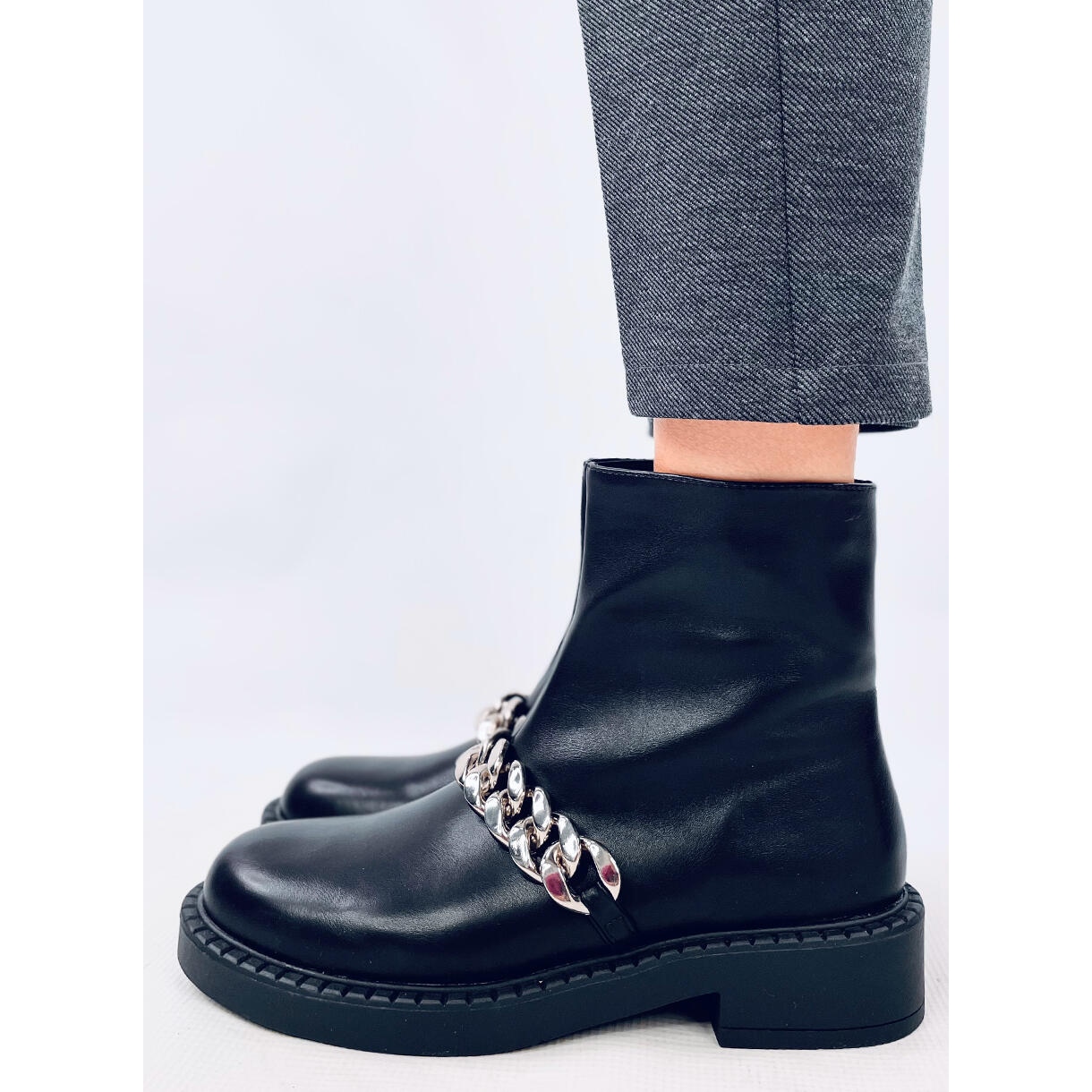En imponerande silverkedja lägger till karaktär och gör att stövlar sticker ut från andra modeller. En blixtlåsfästning på sidan av den övre är en garanti för komfort, vilket möjliggör snabb att sätta på och ta bort skor. Dessutom är interiören vadderad med en delikat päls, som säkerställer komfort och värme, även på svalare dagar.