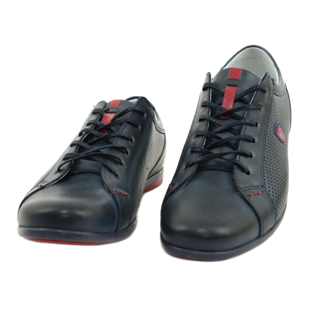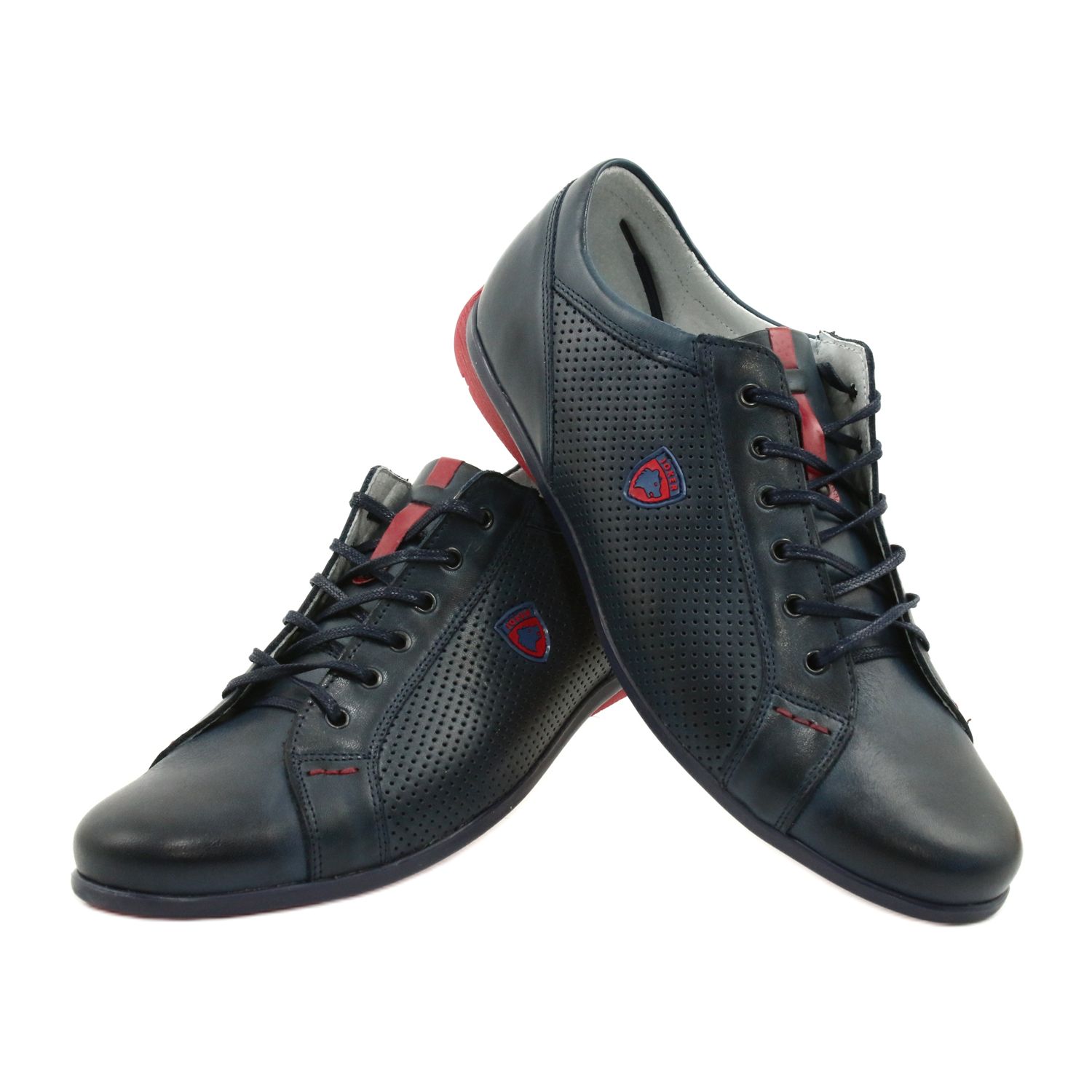 Joker 295 vardagsskor för män i marinblått med röda accenter är ett perfekt val för män som värdesätter komfort och stil varje dag. Tillverkade av högkvalitativt naturligt läder, dessa skor utmärks av en slät ovandel, subtilt framhävd endast av snören och präglade hål på sidorna.