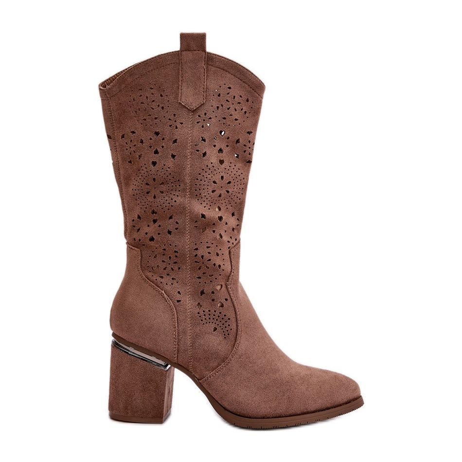 Detaljer: Genombrutna cowboystövlar för kvinnor på höga klackar Eco Mocka Brun S.Barski HY42-028