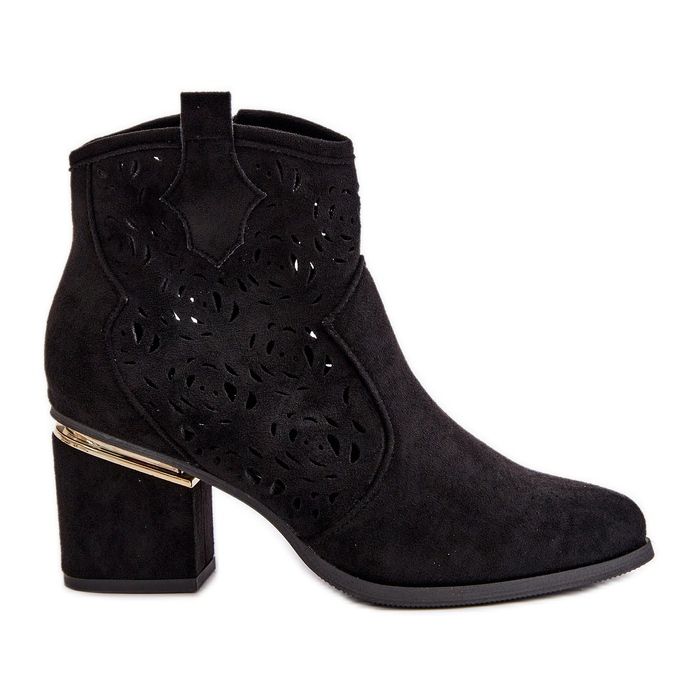 Detaljer: Genombrutna cowboystövlar på hög klack, fästs med dragkedja, svart vosilara