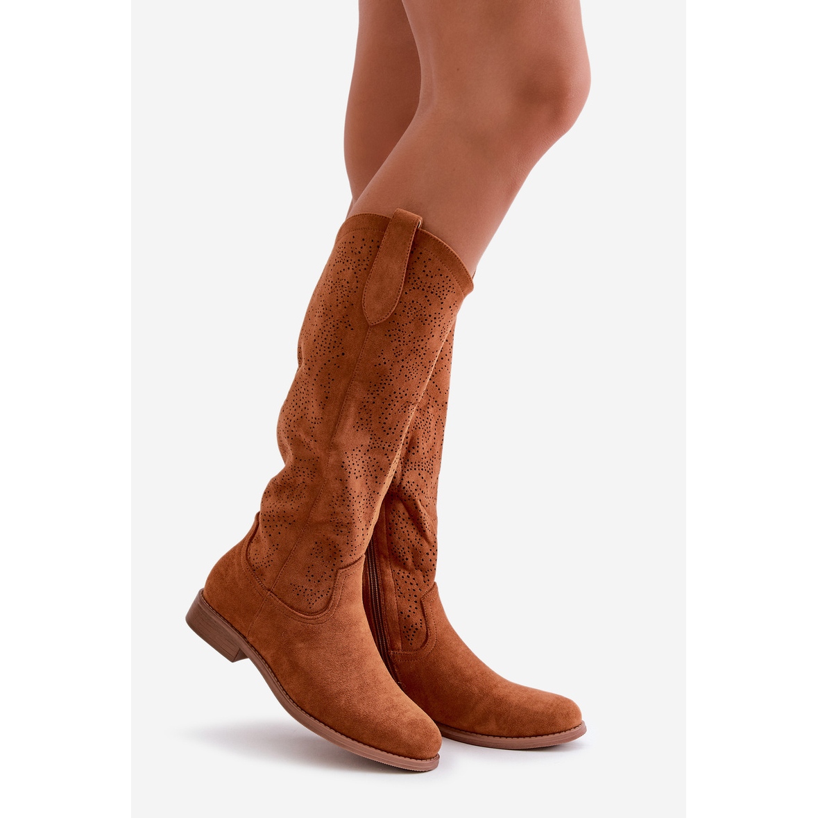 OpenWork-stövlar är ett måste för varje kvinna som värderar mode och komfort. Tack vare den platta hälen passar den här modellen både vardagliga, lösa stiliseringar och eleganta kläder. Den övre höjden på 38 cm och en bredd på 16,5 cm garanterar en perfekt passform, och den runda näsan ger dem en subtil karaktär.