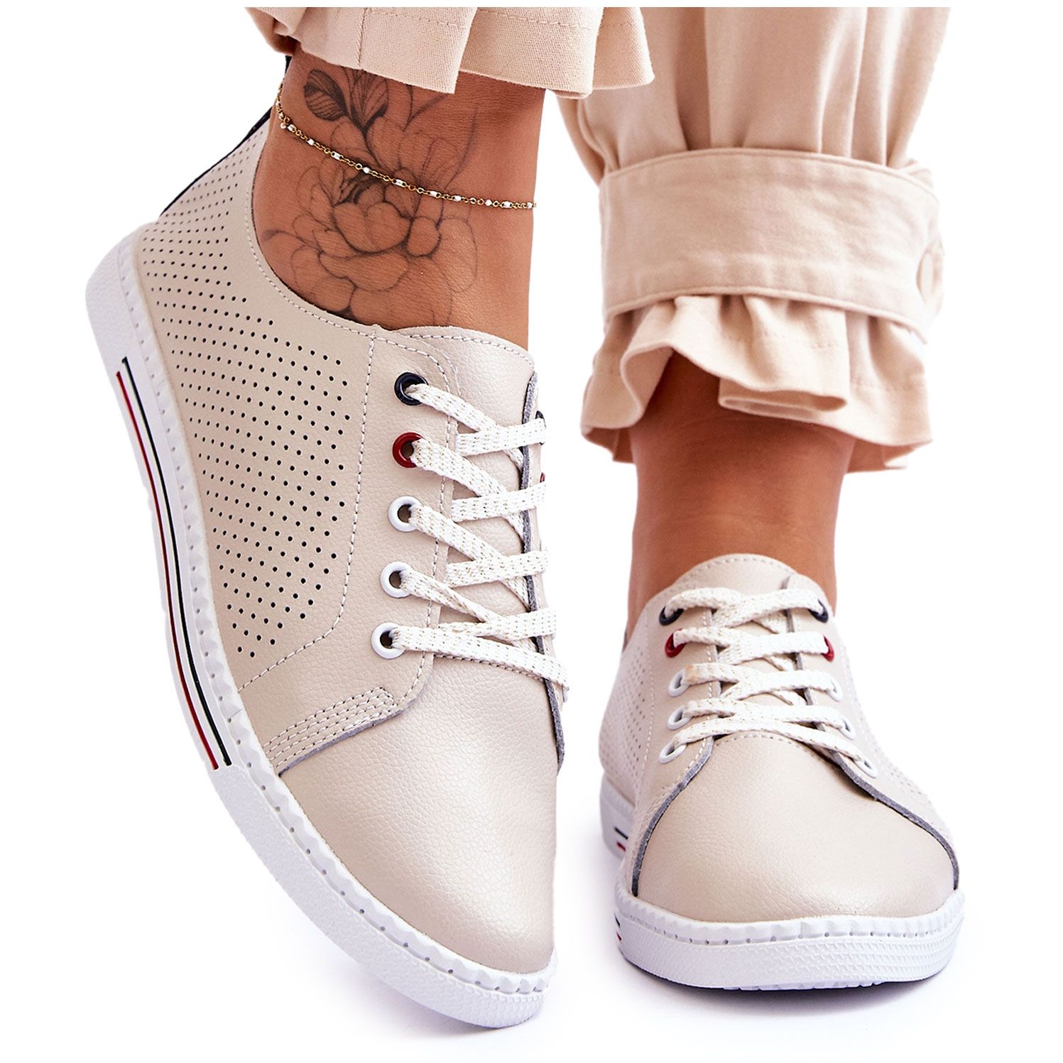 S. Barski Ferone - Women's Openwork Leather Sneakers (Beige)