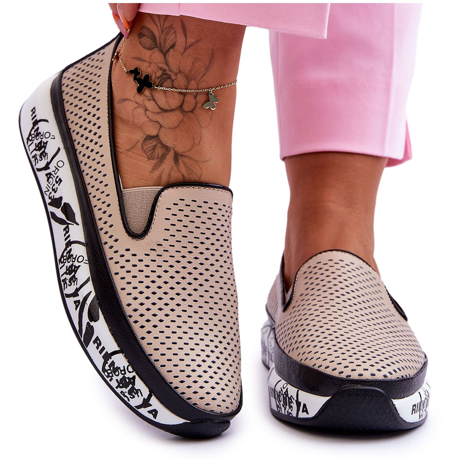 Detaljer: S.Barski Genombrutna lädersneakers för kvinnor Slip-On Beige Sorito