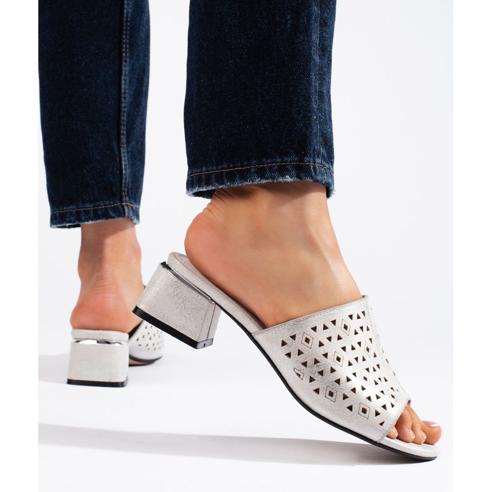 Detaljer: Genombrutna silverflip-flops med låg klack