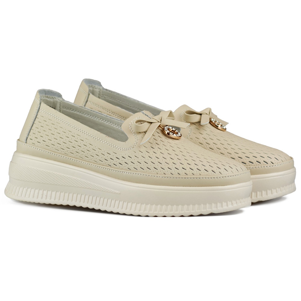 Kvinnaskor med läder är det perfekta valet för kvinnor som värderar komfort och en elegant utseende. Tillverkade av naturläder kombinerar dessa beige loafers stil med funktionalitet. Deras OpenWork -design ger tillräcklig ventilation, vilket gör dem till ett utmärkt val för våren och sommardagarna.