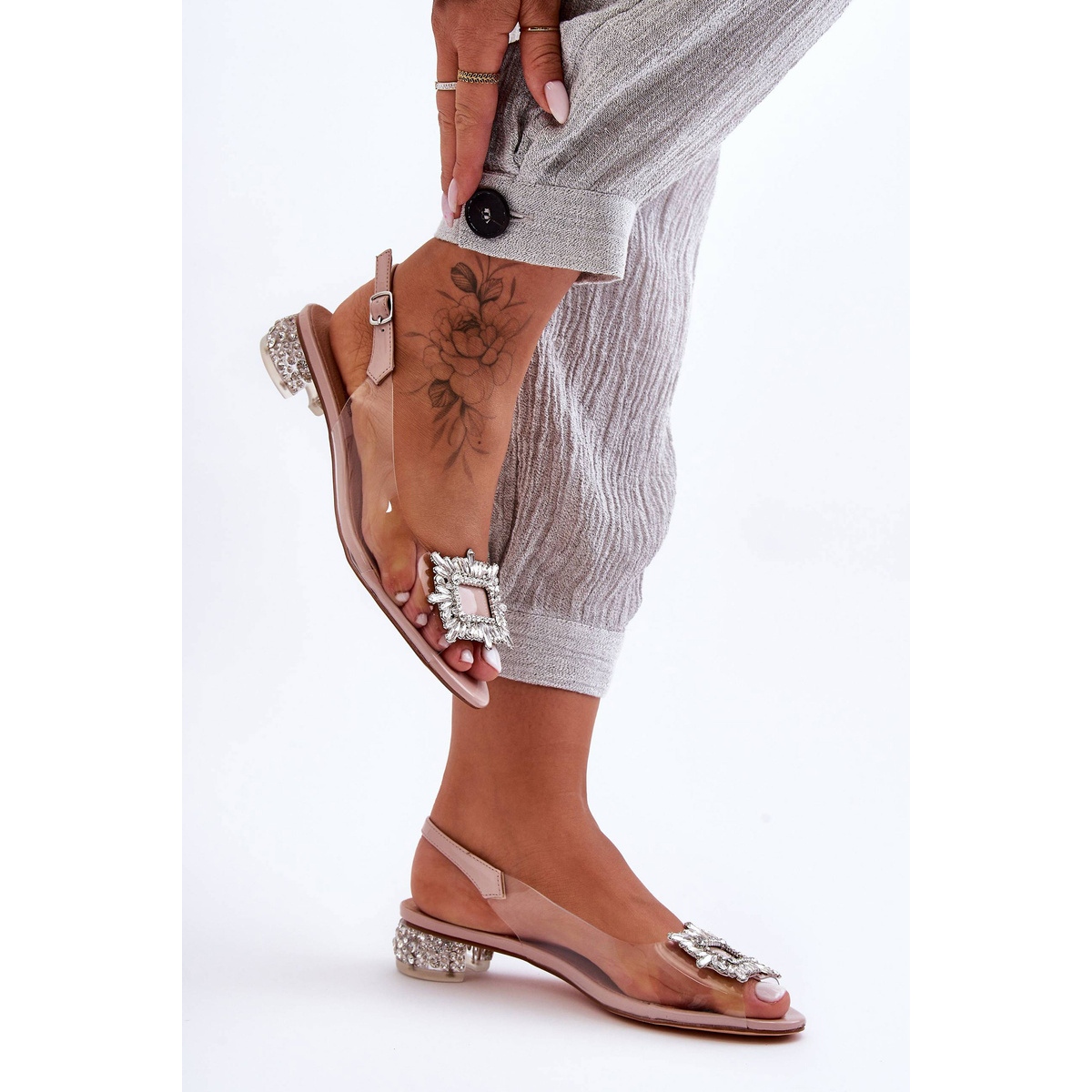 Eleganta, feminina sandaler som kommer att ge lätthet till all stilisering. En transparent övre kombinerad med en smyckedekoration framtill och silverelement skapar en subtil, fashionabla effekt. Ställ på en platt, 3 cm häl dekorerad med dubbar - perfekt på våren och sommaren när du letar efter en kombination av komfort med elegans.