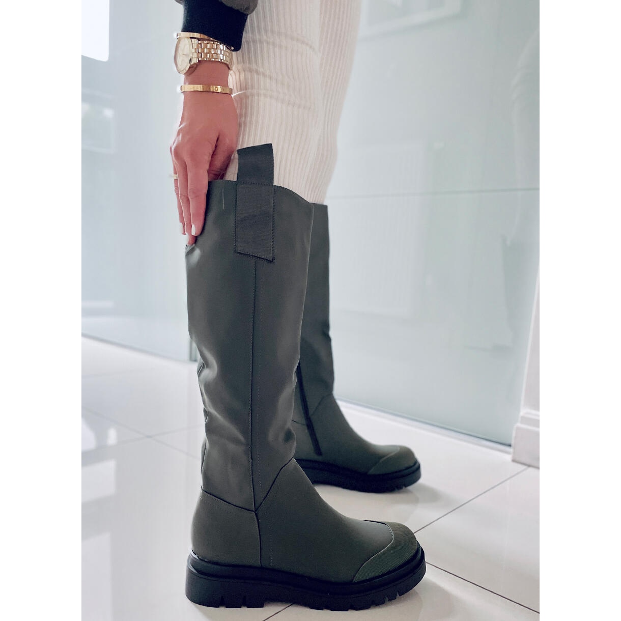 Tack vare en platt klack och en upphöjd plattform är dessa modeller inte bara bekväma, utan ger också lätthet till varje steg. Stövelns höjd, som når till knäet, förlänger benen optiskt och passar perfekt till en mängd olika stilar, från avslappnad till mer elegant.