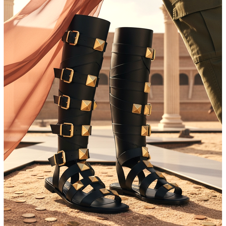 Den mest vågade versionen. För säsongen 2026 upplever denna stil en renässans. Höga gladiatorboots i musketörstil med läderremmar på mitten av låret är ett förslag för kvinnor som vill väcka uppmärksamhet. De bärs med maxiklänningar med slits eller minimalistiska set i grekisk stil.
