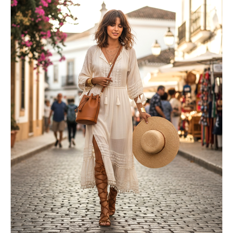En luftig klänning i boho-stil med broderier eller fransar harmonierar naturligt med läderestetiken hos gladiatorskor. Välj cognac eller naturliga bruna sandaler med en klänning i nyanser av ecru, terrakotta eller dämpat grönt. Detta set fungerar både på strandbanan och på sommarmässor eller vernissager.