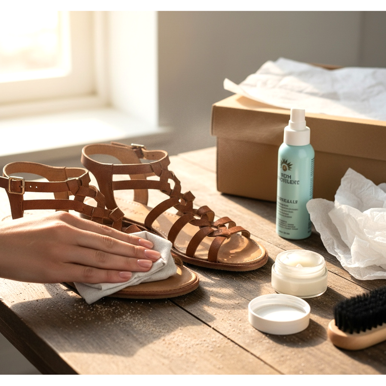 Förvara gladiatorer vikta eller inslagna i silkespapper, borta från direkt solljus. Långvarig exponering för solen kan missfärga huden och förvränga sulans form. Korrekt förvaring garanterar att ditt favoritpar kommer tillbaka till dig i perfekt skick nästa sommar.