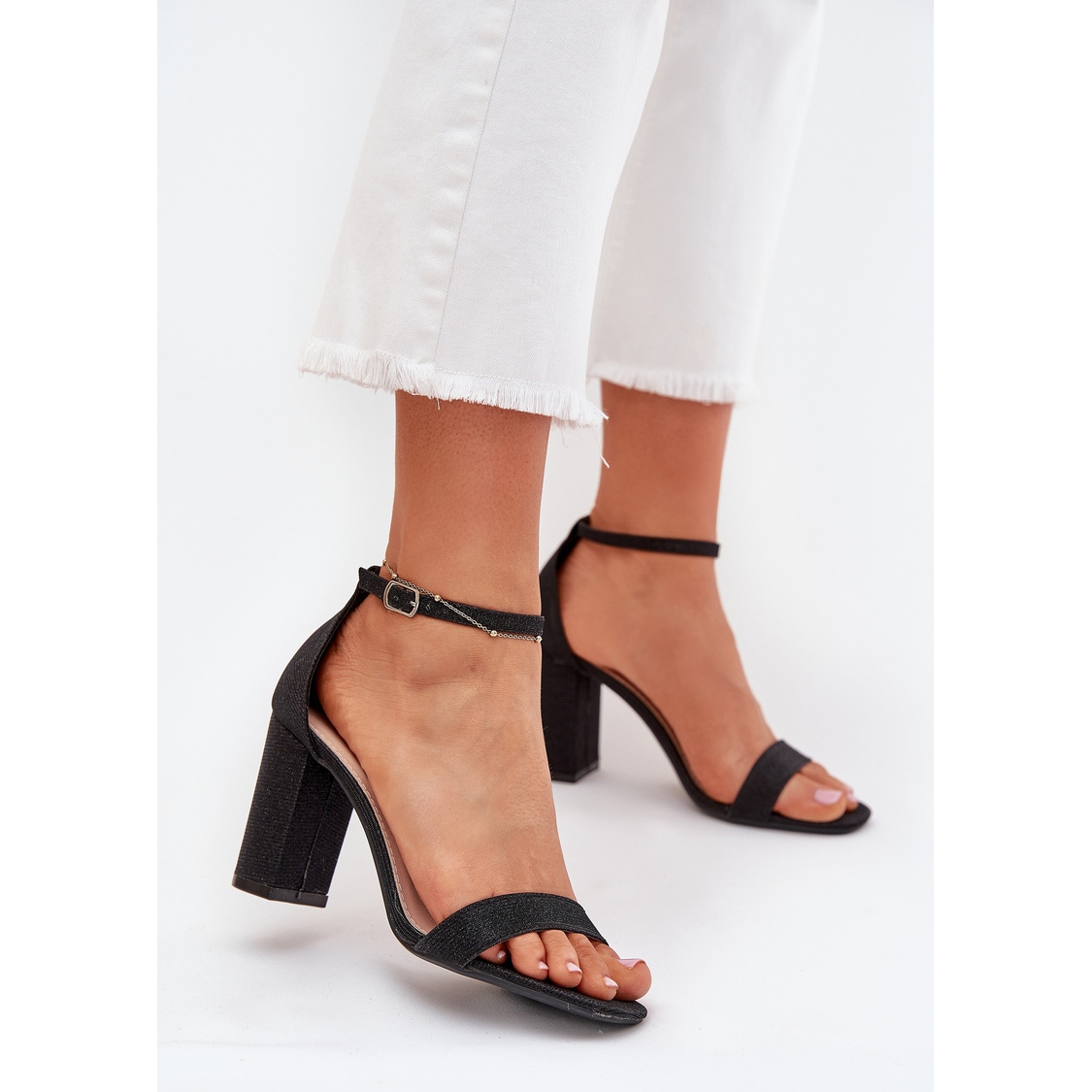 Höjdhöjden är 9 cm, vilket gör att fötterna ser effektiva ut, och samtidigt förblir sandalerna stabila tack vare hälen i form av ett stolpe. De har en läderinsats med uppmärksamhet på detaljer, vilket ökar komforten att bära. Det yttre skiktet var tillverkat av hållbar plast, och sulan gjord av syntetiskt material i svarta passningar perfekt med resten av skor.