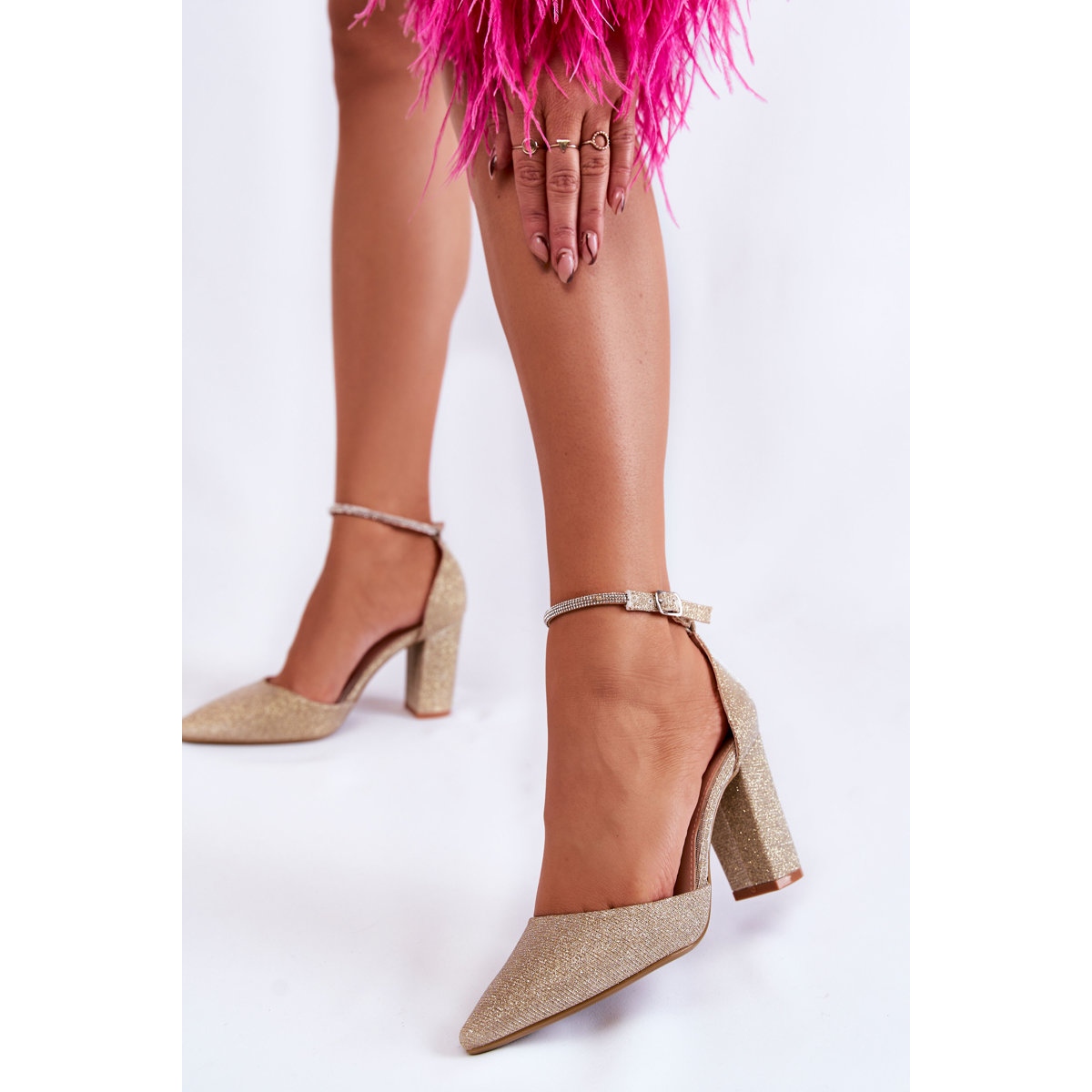 Upptäck elegans och stil med PS1-pumpar i en bländande guldfärg! Dessa fashionabla skor med en stabil blockklack matchar perfekt aktuella trender och ger samtidigt komfort och självförtroende i ditt steg. Fäst runt ankeln med en justerbar rem dekorerad med strass, är dessa spetsiga tåpumps perfekta för en utekväll, en romantisk middag eller en elegant fest.