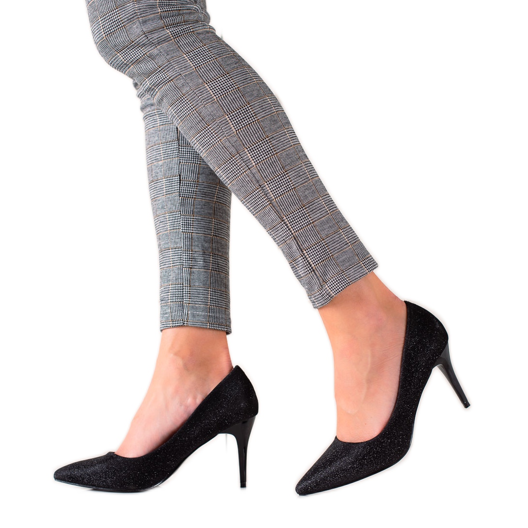 TRENDI glittersvarta höga klackar är ett perfekt val för kvinnor som vill kombinera elegans med lite glans. Dessa snygga pumps, tillgängliga i en djupsvart färg, är gjorda av textilmaterial som vackert reflekterar ljus, vilket ger en unik karaktär till varje styling.