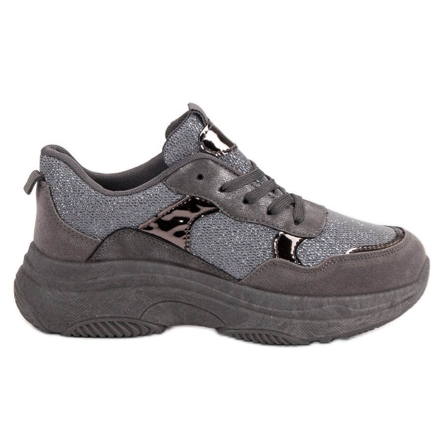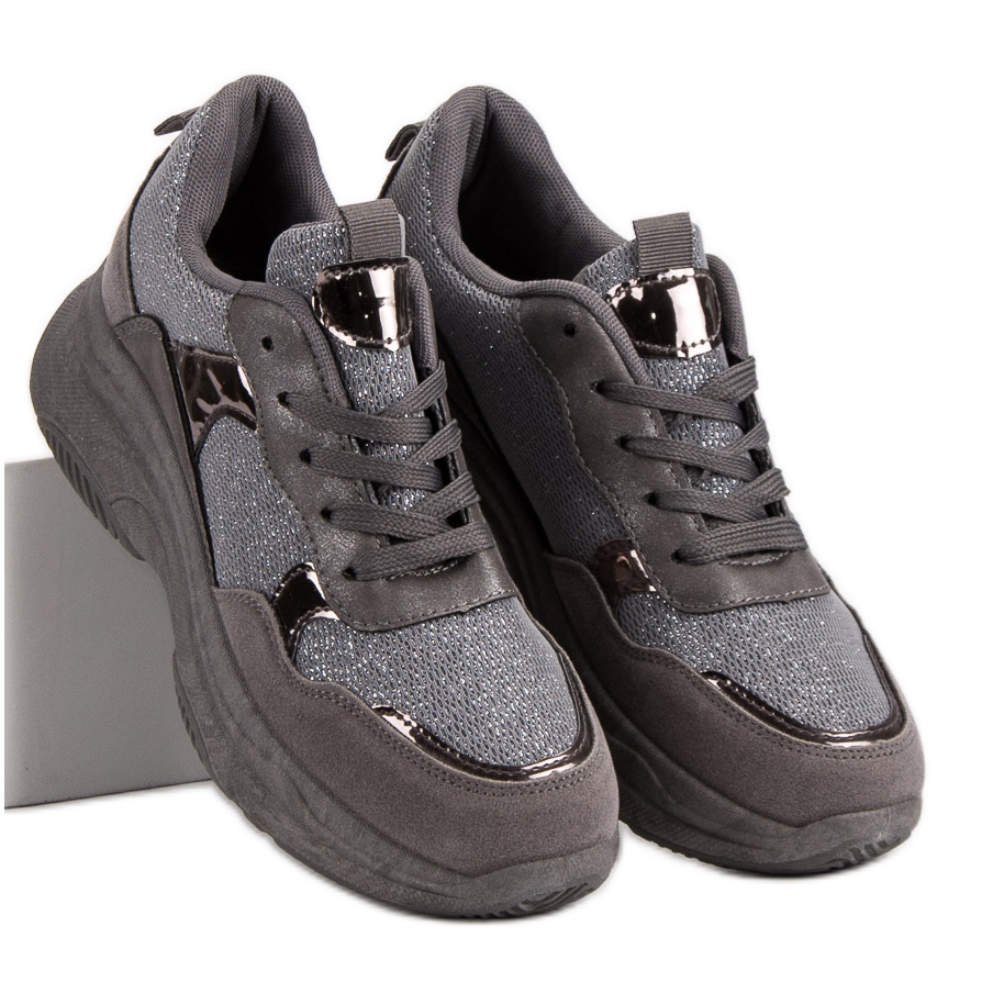 Upptäck grå glittriga plattformssneakers som kommer att bli en oumbärlig del av din garderob! Dessa unika damsneakers, gjorda av ekologiskt patentläder, kombinerar elegans och komfort. Med en 5-centimeters plattform, kännetecknad av en smal form och lätthet, är de ett utmärkt val både för vardagsbruk och för helgresor till bergen eller avkopplande promenader i parken.