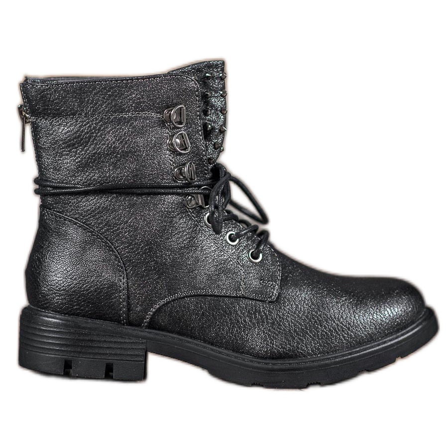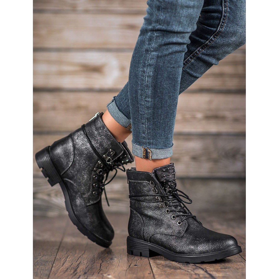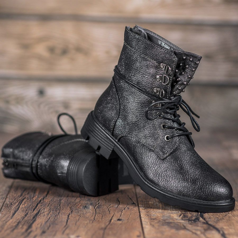 Den 3,5 cm breda hälen säkerställer stabilitet och komfort under vardagliga promenader, och den ankelhöga ovandelen med snören framhäver den fashionabla, avslappnade stilen. En ytterligare dekoration är metallstrålar placerade på plösen på skorna, vilket ger dem ett lite redaktionellt utseende.