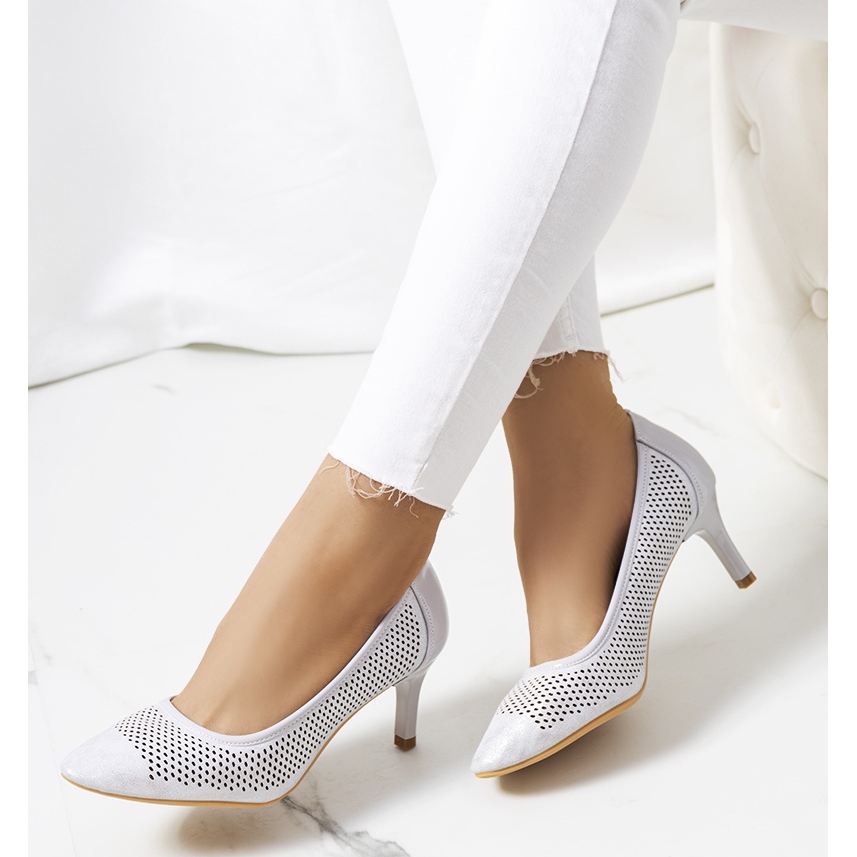 Information: Grå genombrutna pumps på en Carling-klack silver-