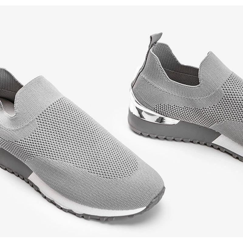 Grey Sneakers Hazel är en universell modell skapad för aktiva kvinnor. Luftigt tyg övre och flexibelt material anpassas perfekt till foten, vilket ger komfort under promenader, löpning eller träning. Den tjockare gummisulan med en höjd av 3,5 cm absorberar varje steg, och den vita kontrasterande färgen på sulan ger en färsk, sportig karaktär. Subtila metalliska detaljer betonar ett fashionabelt utseende utan överdrift.