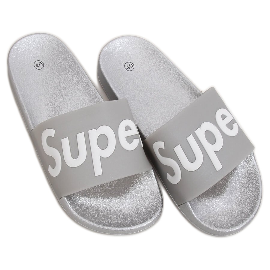 Upptäck komfort och stil i ett tack vare CK110 Silver flipflops för kvinnor i grå och silver! Denna unika modell kännetecknas av den djärva "SUPER"-inskriptionen, som ger den energi och gör varje steg till ett sant nöje. Soliga dagar och sommarpromenader kommer att få en ny dimension tack vare deras korrekt profilerade inre inlägg, som garanterar din komfort, även under långa vandringar.