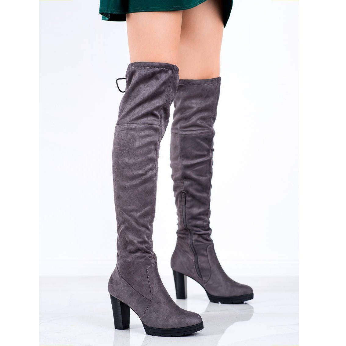 Dessa grå stövlar kommer säkerligen att bli en universell del av din garderob. Den runda tån och 9-centimeters häl i form av ett block ger stabilitet och komfort, även när du är på fötterna under längre tid. Dessutom garanterar plastsulan med slitbana bra grepp, vilket gör dem perfekta för höst och vinter.