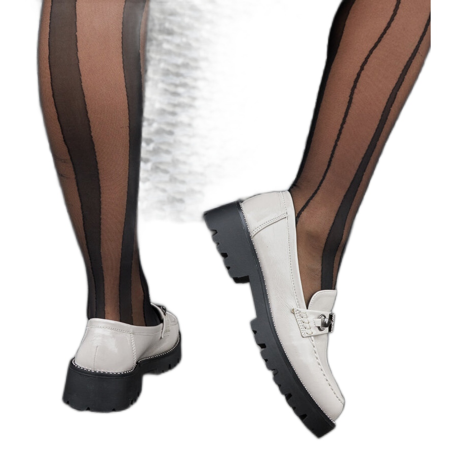 Det är en kombination av bekvämlighet (insatt struktur och läderinsats) med ett elegant, lackerat utseende och subtil glans av zirkoniume - perfekt om du letar efter universella skor som kommer att komplettera både vardagliga och mer eleganta stiliseringar.