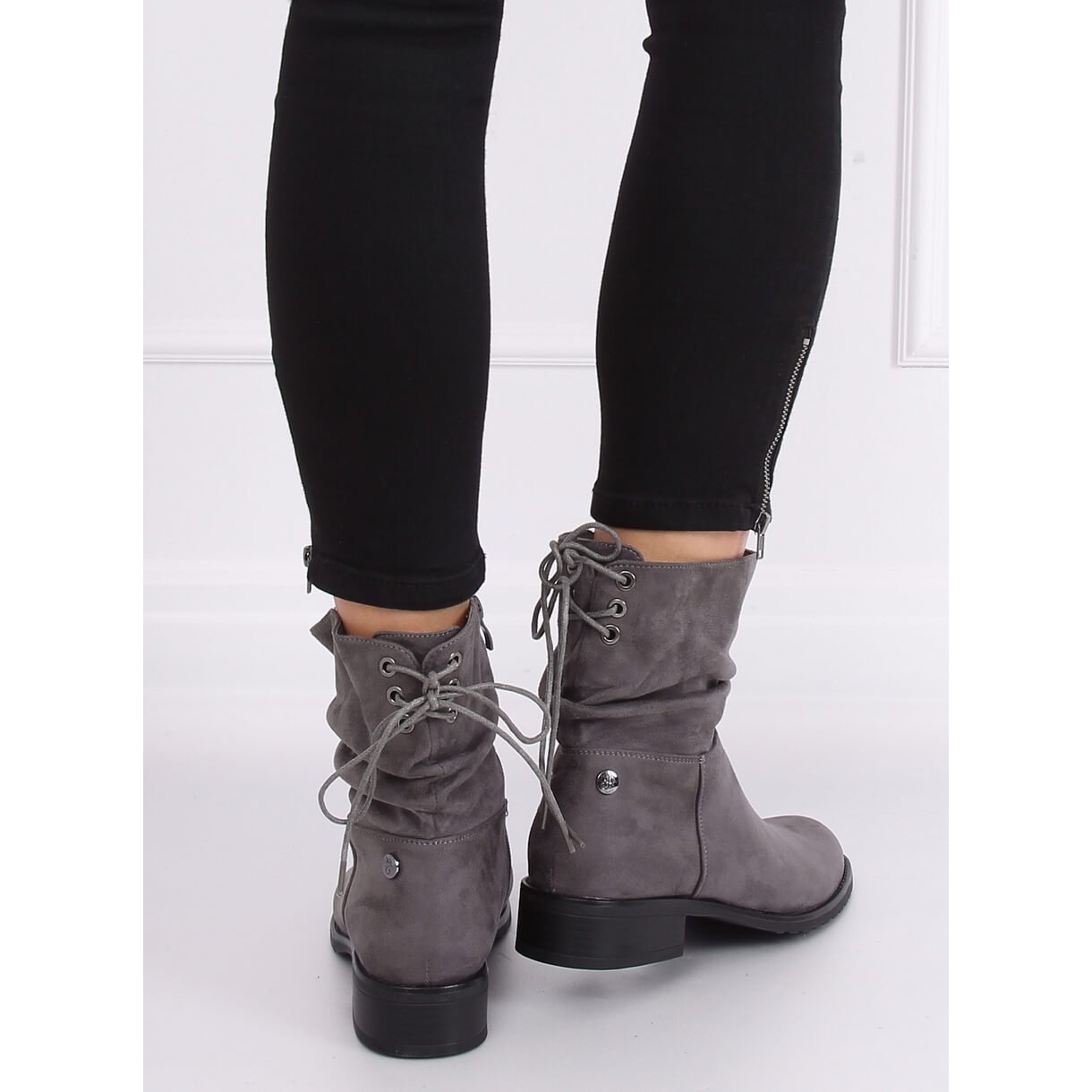 Den övre delen av stövlarna kännetecknas av en intressant rynka och dekorativ snörning baktill, vilket ger dem en unik karaktär. Runda tår garanterar komfort när du har på dig, och en praktisk dragkedja gör det enkelt att ta på och av skorna. Tack vare isoleringen kommer dessa stövlar att vara ett utmärkt val för kallare dagar.