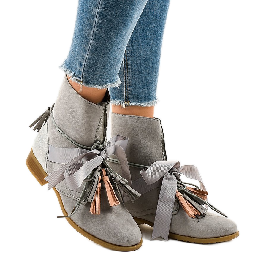 Upptäck en unik stil med grå platta ankelboots med fransar A-226. Dessa eleganta ankelstövlar för kvinnor, gjorda av mockaliknande material, kombinerar modern design och komfort att bära. Intressant dekoration i form av färgglada fransar och band gör dem till ett perfekt komplement till varje styling, vilket ger den en unik karaktär.