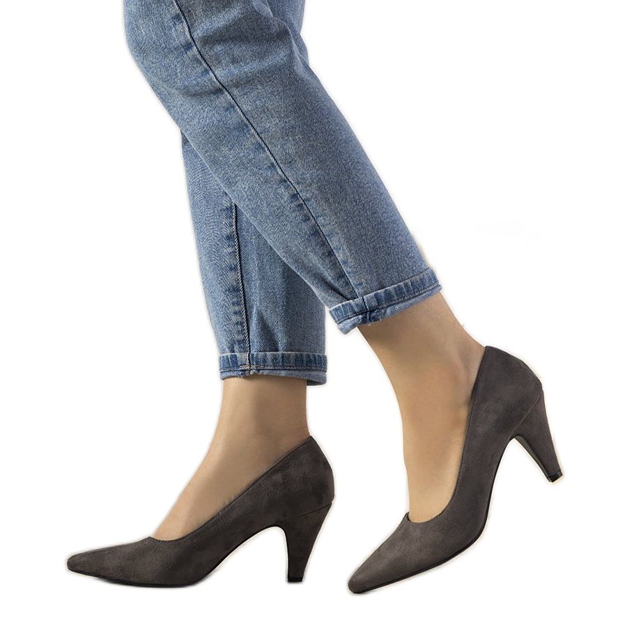 Detaljer: Grå pumps på en tjock Greca -häl