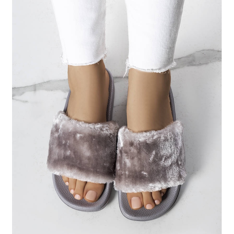 Den klassiska grå färgen på flipflopsna passar bra till olika stilar och en enhetlig sula i samma nyans skapar en sammanhängande helhet. Ett brett bälte täckt med imiterad päls ger charm och en unik karaktär. Dessutom gör en lätt profilering vid tårna att flip-flopsna passar perfekt till fotens form.