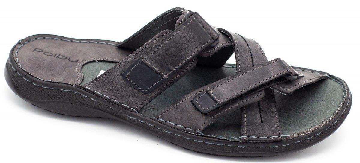 Polbut mäns tofflor SA06 - Grå, bekväm och praktisk lösning för sommaren. En sport, universell snitt kommer att tilltala män i alla åldrar, kolla in både under semesterresor och lika bekväma hemskor eller för helgen. De är helt gjorda av naturligt (yttre och inre) läder och ger en trevlig känsla av "promenad barfota" medan de isolerar från marken. Den profilerade innersulan upprätthåller fotstallen, och den lätta sulan gjord av högkvalitativ material garanterar komfort under dagen.