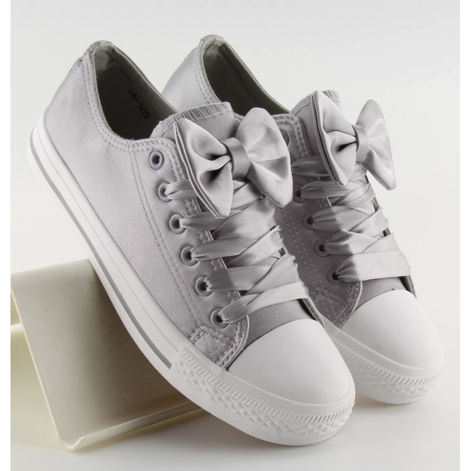 Grå satinsneakers för kvinnor 16-509 Grå är extraordinära skor som kombinerar klassisk och originalitet. Dessa sneakers är gjorda av ömtåligt satinmaterial och sticker ut inte bara för sitt eleganta utseende, utan också för sin komfort att bära. Istället för traditionella spetsar används ett band, vilket ger dem en unik karaktär. En charmig rosett som enkelt kan tas av gör att du kan förvandla skorna till klassiska sneakers och matcha dem till olika stilar.