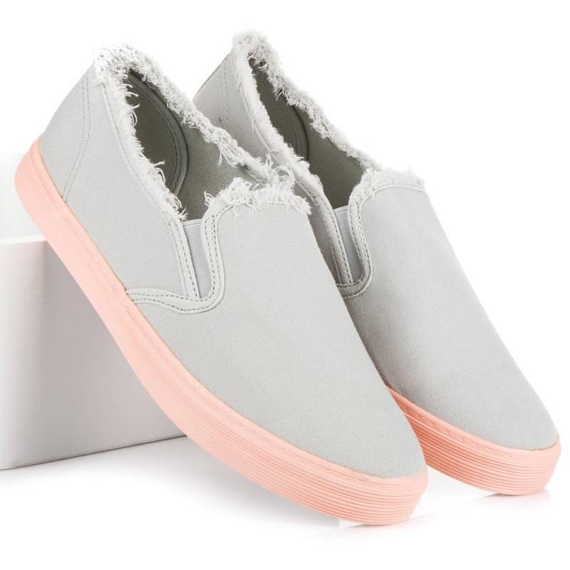 Slipons kännetecknas av en platt sula utrustad med en slitbana i en fashionabel rosa färg, vilket ger en unik karaktär till hela skodonet. Den runda tån och den inbyggda, mjuka hälen gör att dessa skor passar perfekt till foten och ger tillräckligt stöd och komfort.