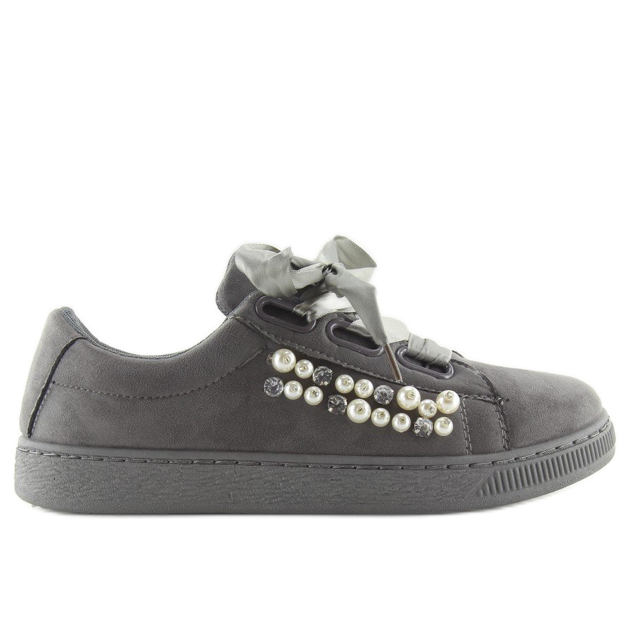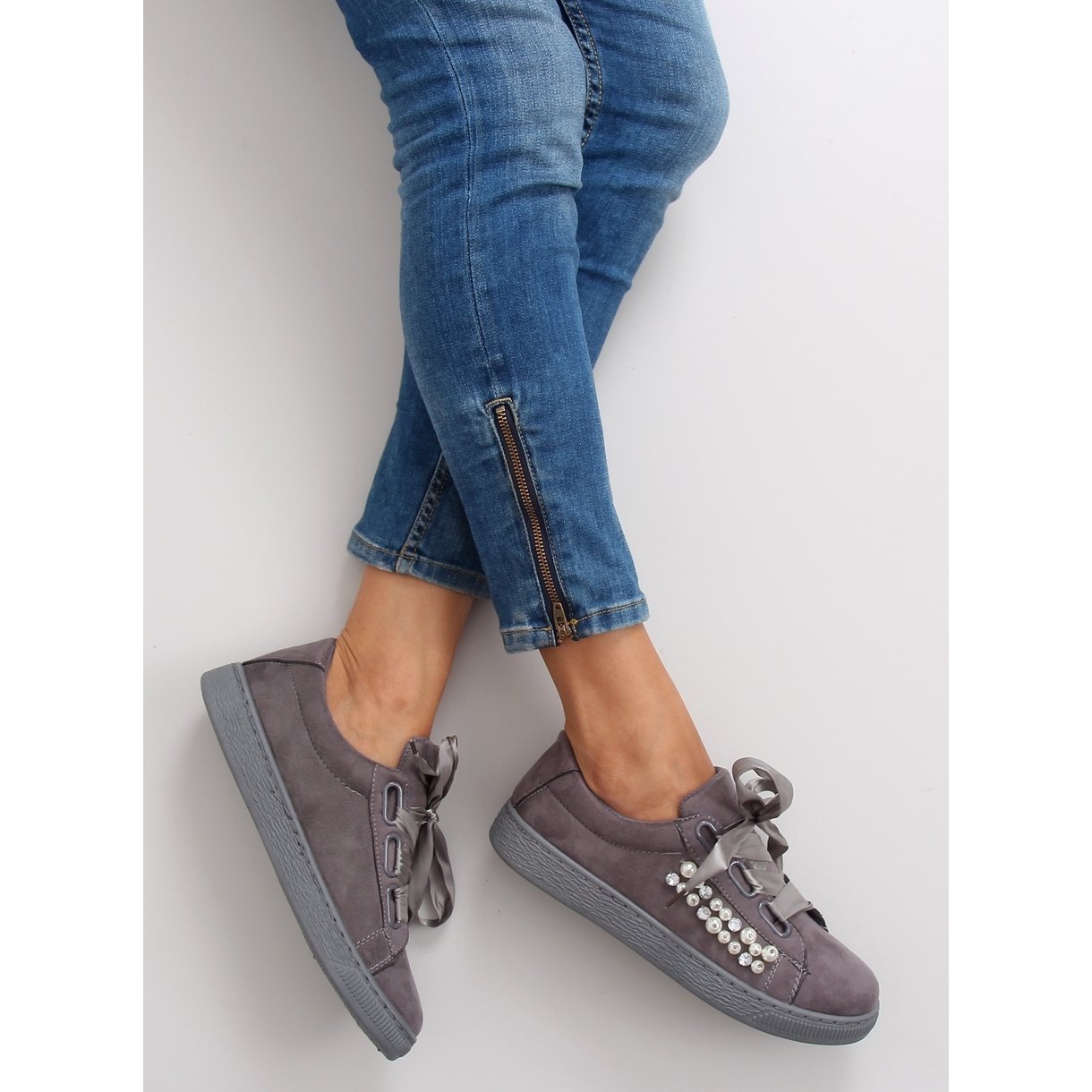 Grå H99-11 Grå sneakers med pärlor är unika damskor som perfekt kombinerar moderiktig design med komfort att bära. De kännetecknas av en delikat dekoration som ger dem en romantisk karaktär - istället för traditionella spetsar används ett elegant satinband, vilket är i linje med säsongens senaste trender.