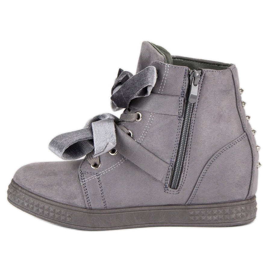 Vi presenterar gråa sneakers med rosetter från varumärket Super Me - perfekta skor för varje modern kvinna som värdesätter original stil och komfort. Dessa unika skor kombinerar en häftig karaktär, tack vare dekorativa nitar och nitar, med en charmig, flickaktig ton som ges av rosetter.