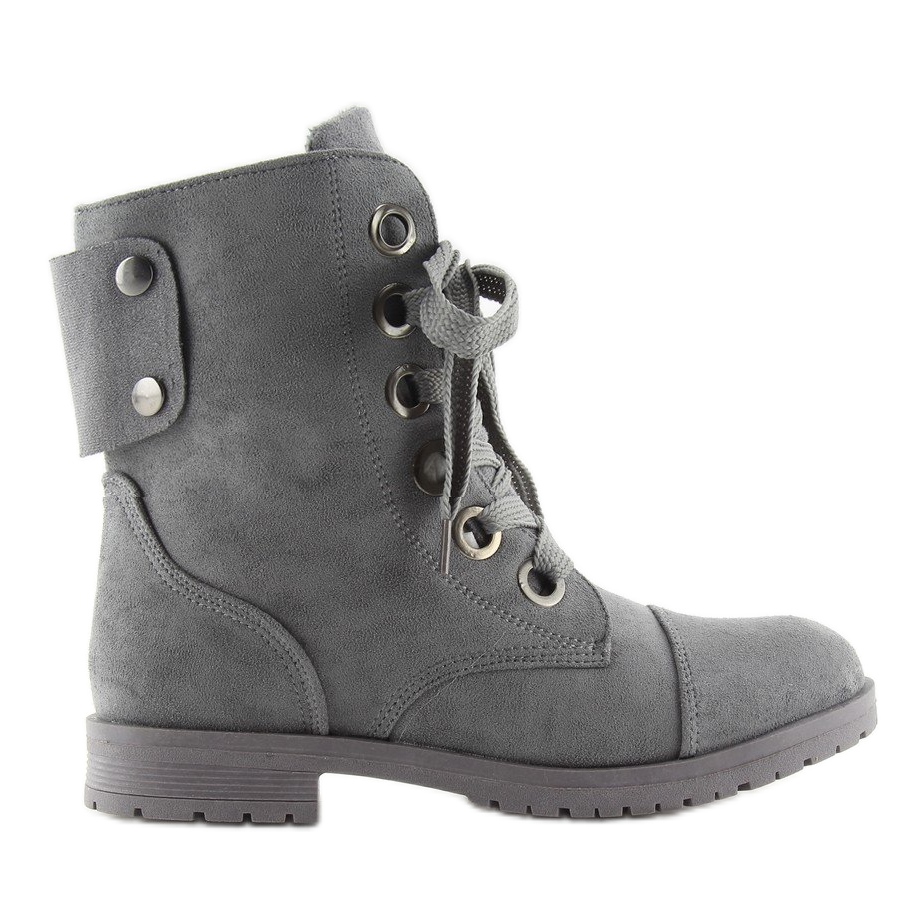 Upptäck den unika stilen och komforten som erbjuds av arbetsstövlar med snörning i grå 8901. Dessa eleganta stövlar i militärstil för kvinnor kommer att ge en unik karaktär till alla dina stylingar. Det smala snittet understryker fördelarna med den kvinnliga figuren, och strassarna på baksidan av ovandelen ger dem lite kant.