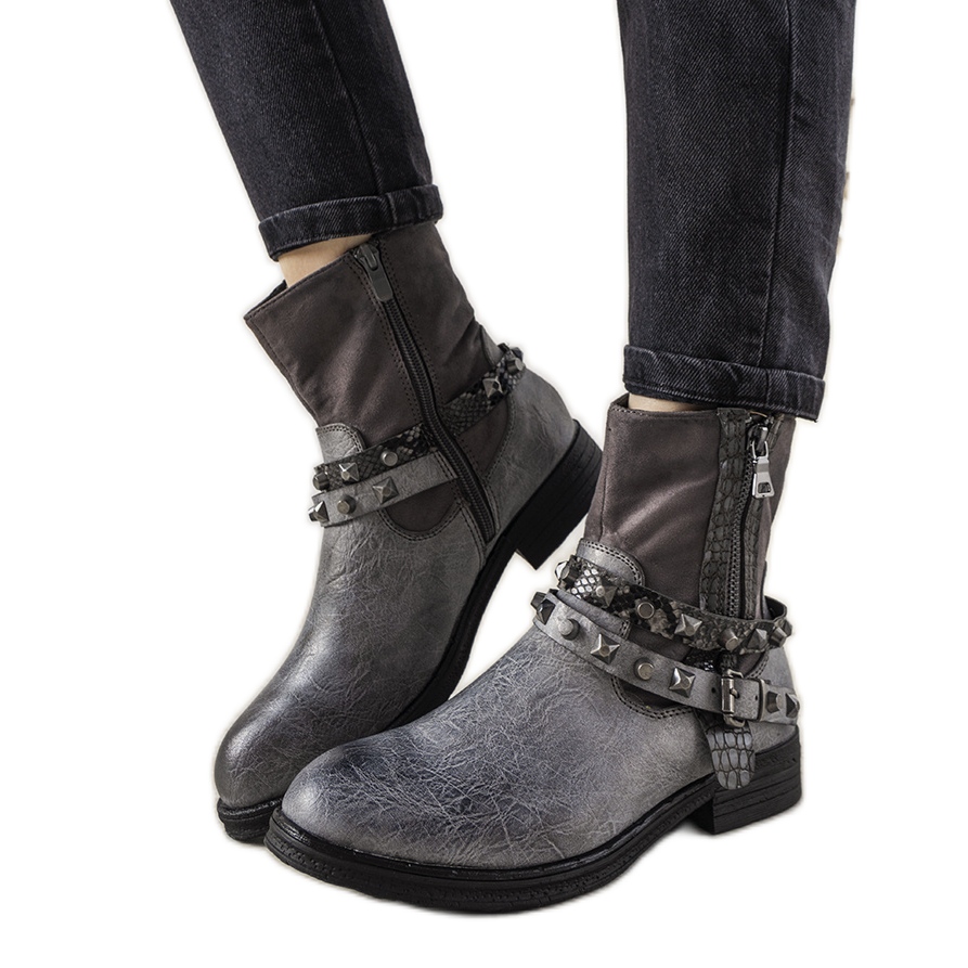 Eleganta kvinnors stövlar i en nyans av grå kombinerar en klassisk, ankelskuren med en sten accent i form av band dekorerade med dubbar. De är gjorda av att kombinera ekologiska och eko-eko-hud, de kommer att vara ett stort komplement till höst- och vinterstyliseringar.