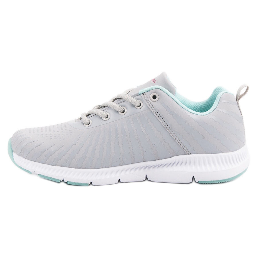 Skorna finns i en dämpad grå färg, dekorerad med vita och mintade accenter, vilket ger dem en fräsch och modern look. Tack vare den inbyggda, mjuka hälen och den runda tån ger de hög bärkomfort, perfekt för dagligt bruk. Sulan i plast med slitbana garanterar bra grepp vilket gör dem lämpliga för olika underlag.