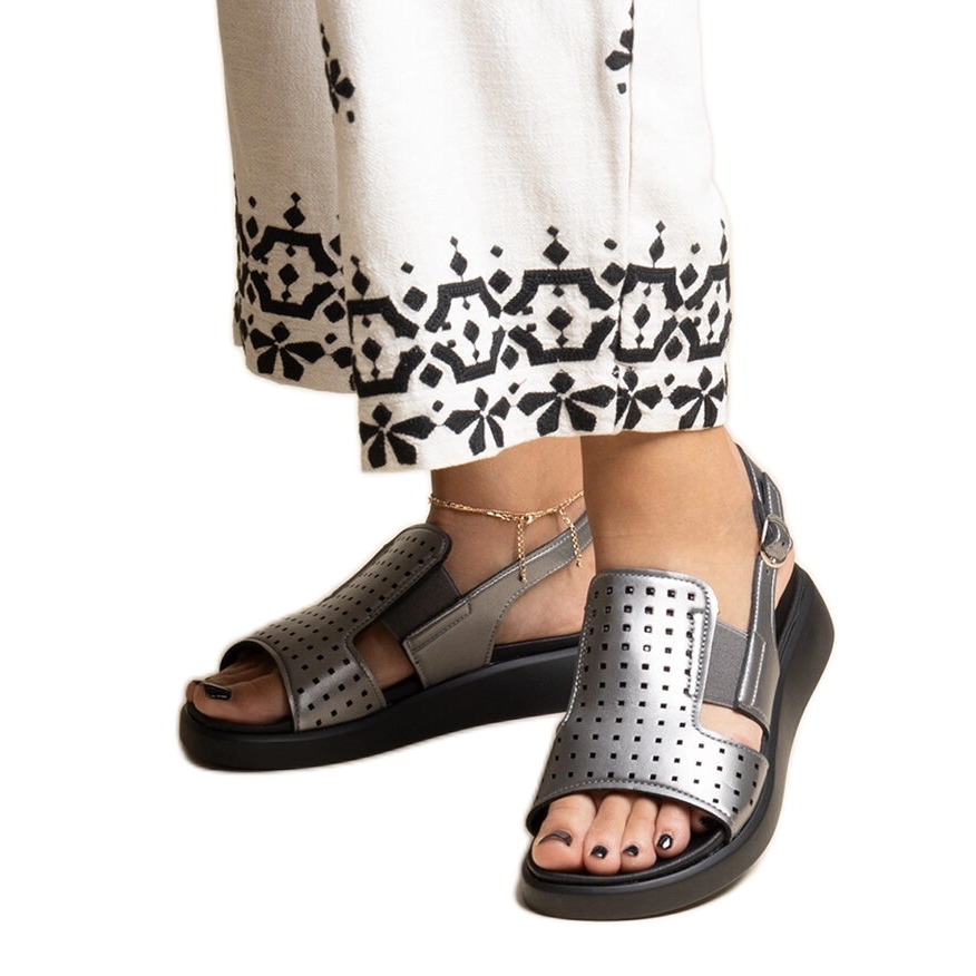 Grafitsandaler med en OpenWork Imogne -övre i en grå nyans är ett förslag som imponerar med sin moderna design. De är skapade av ekologiskt läder och plast av hög kvalitet och kombinerar elegans och komfort att bära, vilket gör dem till ett utmärkt val för varma sommardagar.