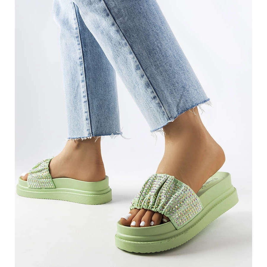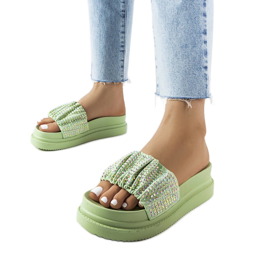 Gröna flip flops med dekorativa zirkoner är ett förslag för kvinnor som värderar modern, modern design och bär komfort. Slidda struktur, gummisula och dekorativa glänsande detaljer gör flipporna bra för en daglig basis under sommarsäsongen.